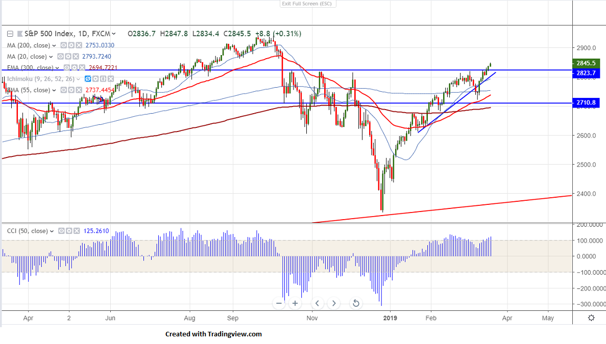 S&P500 trading higher for fifth consecutive day and jumped more than 4.5% from low of 2720 made on Mar 8th 2019.The index was trading higher nearly fresh 2-1/2 month and jumped more than 20% from low of 2334 on easing US--China trade tensions and increasing risk appetite. It hits intraday high of 2847 and is currently trading around 2846.5. Markets eye Fed monetary policy for further bullishness. Fed is expected to be more dovish and to lower its “dot plot” to show little or no rate hike in 2019.