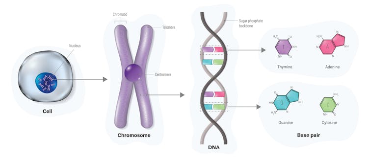 Cell, chromosome, DNA molecule (double helix) and base pairs. Dee-sign/Shutterstock