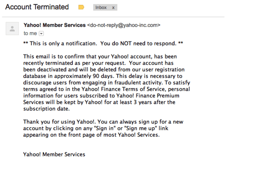 Once users have followed instructions for deleting a Yahoo email account, the actual details of the account won’t be cleared from Yahoo’s database for 90 days and even then, Yahoo may retain some information. So even deleting an account doesn’t quite protect current users from future breaches. And if you followed the advice I gave in my last article about Yahoo and switched on Yahoo’s Account Key service, you will have to disable that before terminating the account.