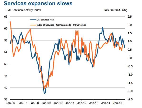 UK's economy is likely to face tougher times if UK's prized service sector slows down. Services form large chunk of net exports and partially shield's UK's massive deficit in goods trade. Moreover a persistent slowdown in services activity will reduce GDP growth and it is the only sector among three (Construction, manufacturing & services) to cross above its 2007 peak.