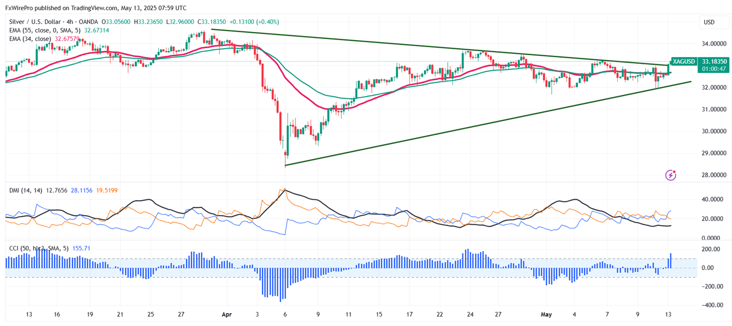 Silver gained sharply as US-China trade tension eased. It hit a high of $33.23 and is currently trading around $33.18.