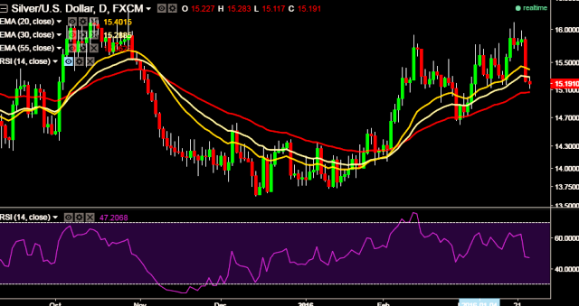 We prefer to take long position in XAG/USD around $15.15, stop loss $15.01 and target $15.32 marks.
