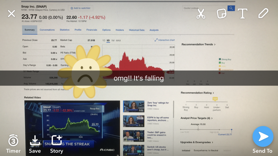 Snapchat’s lofty valuation on the stock market lasted just a little bit longer than one of its user’s disappearing photos. On its third day of trading on the NY Stock Exchange, Snapchat’s parent company Snap’s share price, fell over 12% to below its IPO launch price of US $24 last Thursday. At the time of publication, the price opened a further 9% down at US $21.60.