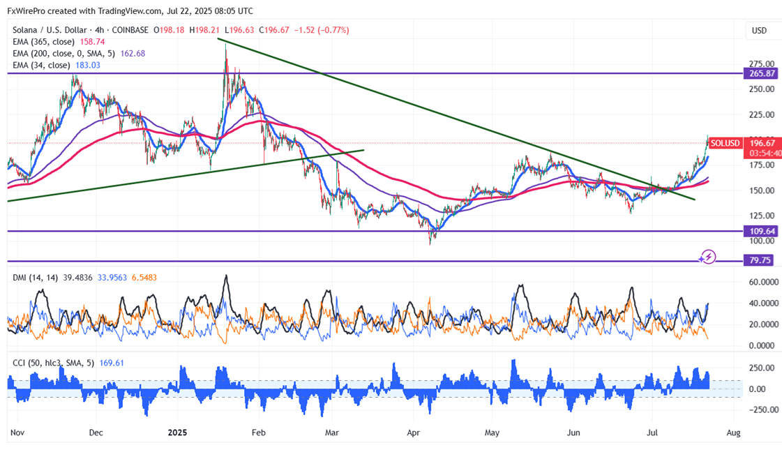The SOL/USD surged more than 60%in past one month. Near-term support is identified at $180, with a drop below this level potentially leading to targets of $140/$123/$117/$100. Immediate resistance is noted at around $205 where a breach could push prices up to$225/$265, or even $300. It is good to buy on dips around $180, with a stop-loss set at $140 and a target price of $300.