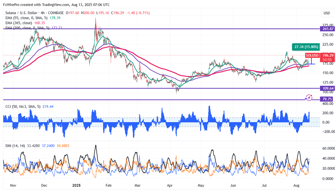 The SOL/USD surged more than 15% in past one month. Near-term support is identified at $180, with a drop below this level potentially leading to targets of $140/$123/$117/$100. Immediate resistance is noted at around $205 where a breach could push prices up to$225/$265, or even $300. It is good to buy on dips around $180, with a stop-loss set at $140 and a target price of $300.
