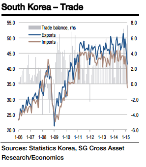 Societe Generale says that their forecasts for yoy growth in exports and imports in March are lower than that of the yoy growth for January and February combined (-2.1% for exports, -15.2% for imports).