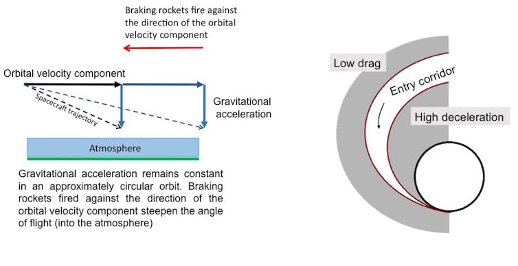 But the angle of entering the atmosphere matters. If it’s too steep, the capsule will experience excessive deceleration. If it’s too shallow, there will not be enough drag force to slow the craft down sufficiently for landing. It is even possible to end up skipping the spacecraft along the atmosphere, like skimming a stone on a pond. Therefore, the spacecraft needs to travel within a narrow range of possible angles called the “entry corridor”.