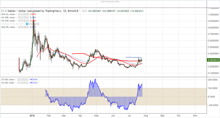 XLM/USD has jumped more than 25% from the low of $0.2550 after IBM news on Stable coin. The pair hits high of $0.328800 on Jul 19th 2018 and is currently trading around $0.3020.