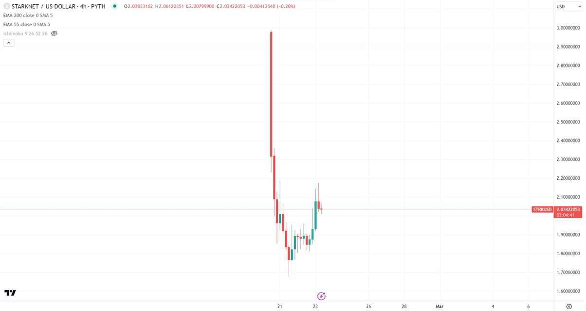 STRKUSD pared more than 40% from its high of $2.98 made after the launch. It hit a high of $2.98 and is currently trading around $2.02.