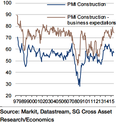 "These trends only change slowly over time. Overall, the construction PMI should rise from 57.3 to 57.8", says Societe Generale.