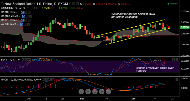 - Strong support is at 0.6670 (channel base and cloud top), while resistance on the upside is located at 0.6717 (10 DMA) ahead of 0.6740 (Dec 7 high).