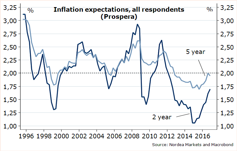 According to Prospera’s quarterly survey, the Riksbank's much watched Sweden inflation expectations for the five-year horizon came in at 1.95 percent in December, down from the 2.00 percent in September. Inflation expectations on the 1-year horizon as well as for the 2-year horizon continued to rise somewhat.