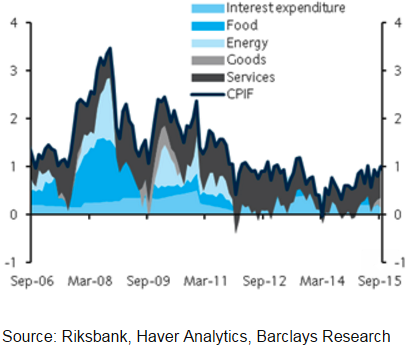 "However, inflation abroad will likely be lower than previously expected, pushing major central banks to pursue further easing for a prolonged period of time. Due to renewed global disinflationary pressures, the Riksbank no longer expects CPIF inflation to hit 2% in 2016, which is now expected to occur in Q1 2017", says Barclays.