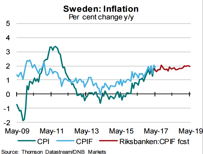 "Inflation has been hovering close to, but below target the last months. However, Riksbanken has already announced that it will extend APP in H2 and that inflation is still very dependent of expansionary monetary policy to stabilize at target. Hence, we need more than a couple of observations at target for Riksbanken to be happy," said DNB Bank in a report.