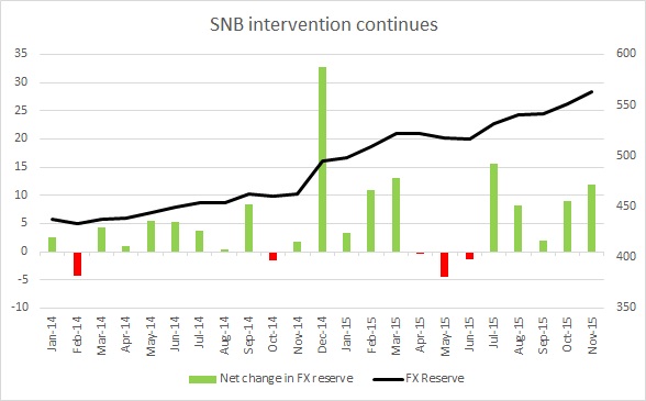 Since July SNB FX reserve increased by $49.8 billion or $9.4 billion per month. However with ECB providing lesser than expected stimulus, SNB balance sheet is likely to increase at much slower rate at least in first half of 2016.