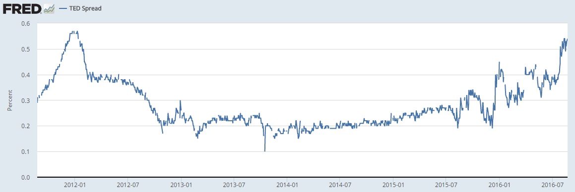 TED spread, which can be seen as the premium for additional risks over risk-free rate, is currently at the highest level since 2012 when the U.S. government came closest to a technical default.