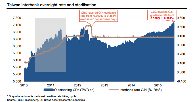 Taiwan's central bank reportedly lowered the overnight (O/N) guidance rate for a third consecutive day by another 0.2bp to 0.382% for a total of 0.6bp. This is after a long period of stability dating back to August 2012. The 14-day certificate of deposit (CD) rate issued by the central bank will also be lowered to 0.47% from 0.50%.