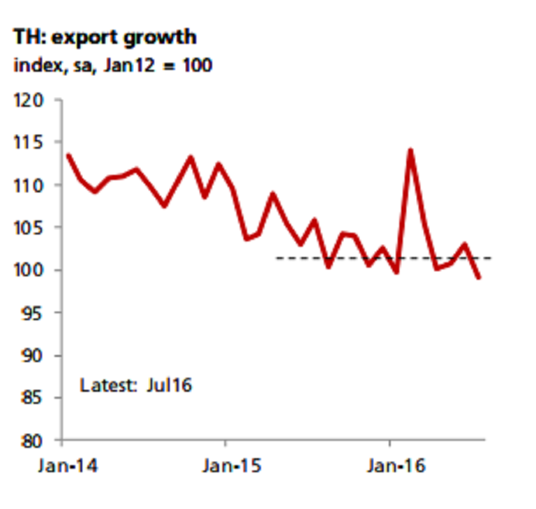 Exports growth in Thailand is expected to register a fourth straight year of decline in 2016 on existing downtrend in monthly exports, except for the temporary surge during the first half of this year, which can be attributed to exports of gold.