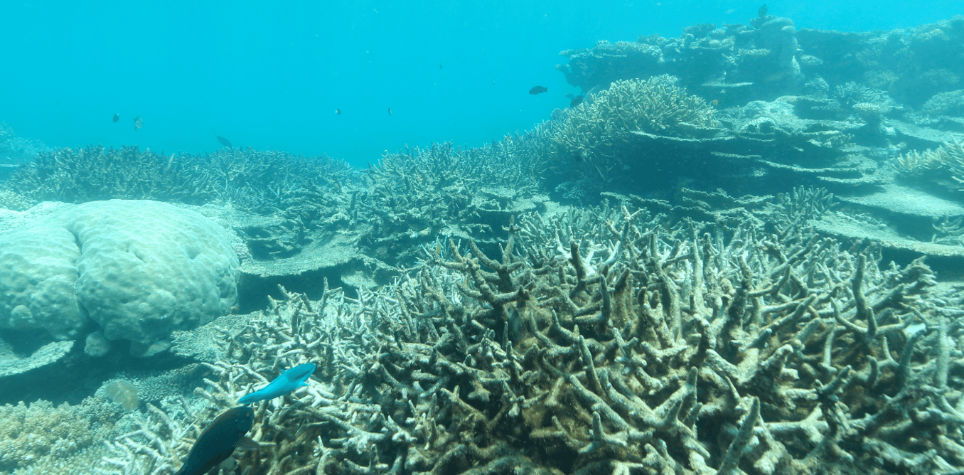 So what did we find? Structurally, the reef appears intact, but the whole landscape is, well, subdued. While pockets of brilliant blue staghorn remain, much of the coral that bleached earlier this year is dead, the white skeletons filmed over by greenish-brown filamentous algae.