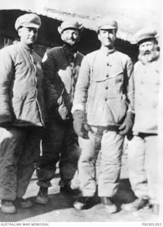 A 1953 Chinese propaganda photograph taken at Camp 5, Pyoktong, North Korea, on the Yalu River near the Manchurian border, of four Australian POWs all captured while serving in Korea with the 3rd Battalion. Australian War Memorial