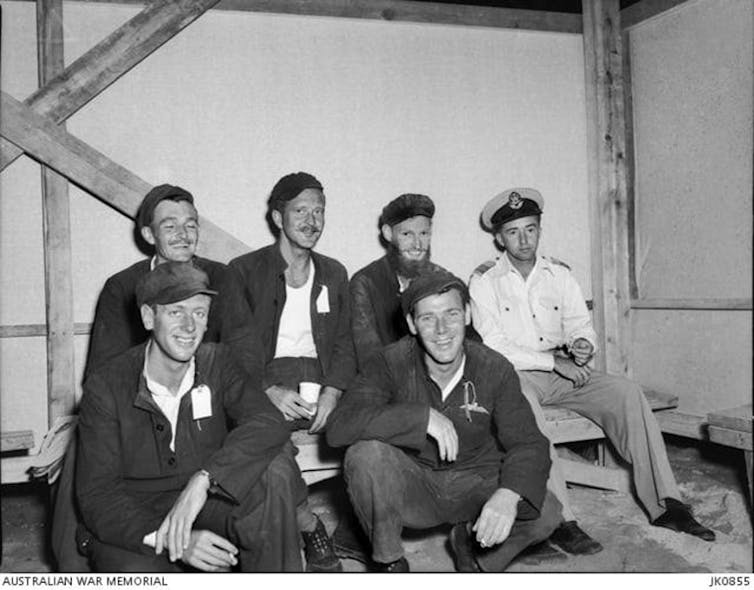 Photographed on release, Guthrie and his companions wear their clothes casually – half-buttoned up, collars gaping over white singlets, caps worn jauntily or backwards. They would shortly change these clothes for their service uniforms. Twenty-nine of the 30 Australians who became POWs returned home, a remarkable survival rate.
