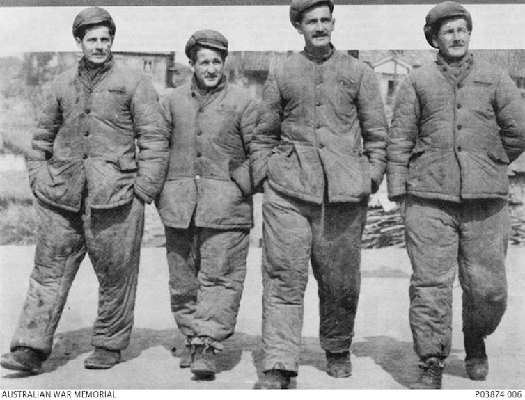 A group of POWs at Pyoktong, North Korea, winter 1952-53. Temperatures sometimes fell as low as -43° C. Warrant Officer Ron Guthrie of 77 Squadron, RAAF, is second from the left. Australian War Memorial