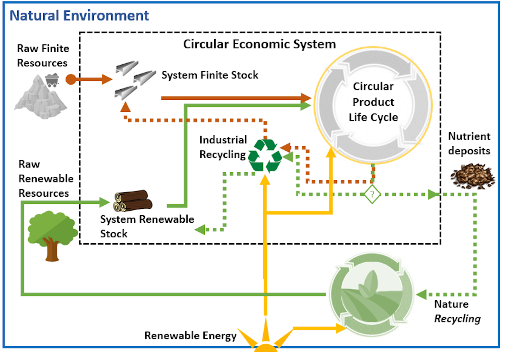 To make an economy fully circular, products have to be designed differently. They have to contain materials that are available and unproblematic – ultimately only renewable ones – sourced in a non-destructive manner, in supportable amounts and assembled into compounds that can be disassembled after usage. Production, consumption and recovery process, as well as recycling and all transportation involved need to be fuelled by renewable energy and the entire amount of activity in a given area should not surpass its carrying capacity. This requires well balanced sizes and activities on the meso level of cities up to the macro level of national economies and the world economy – with its current high level of interchange.