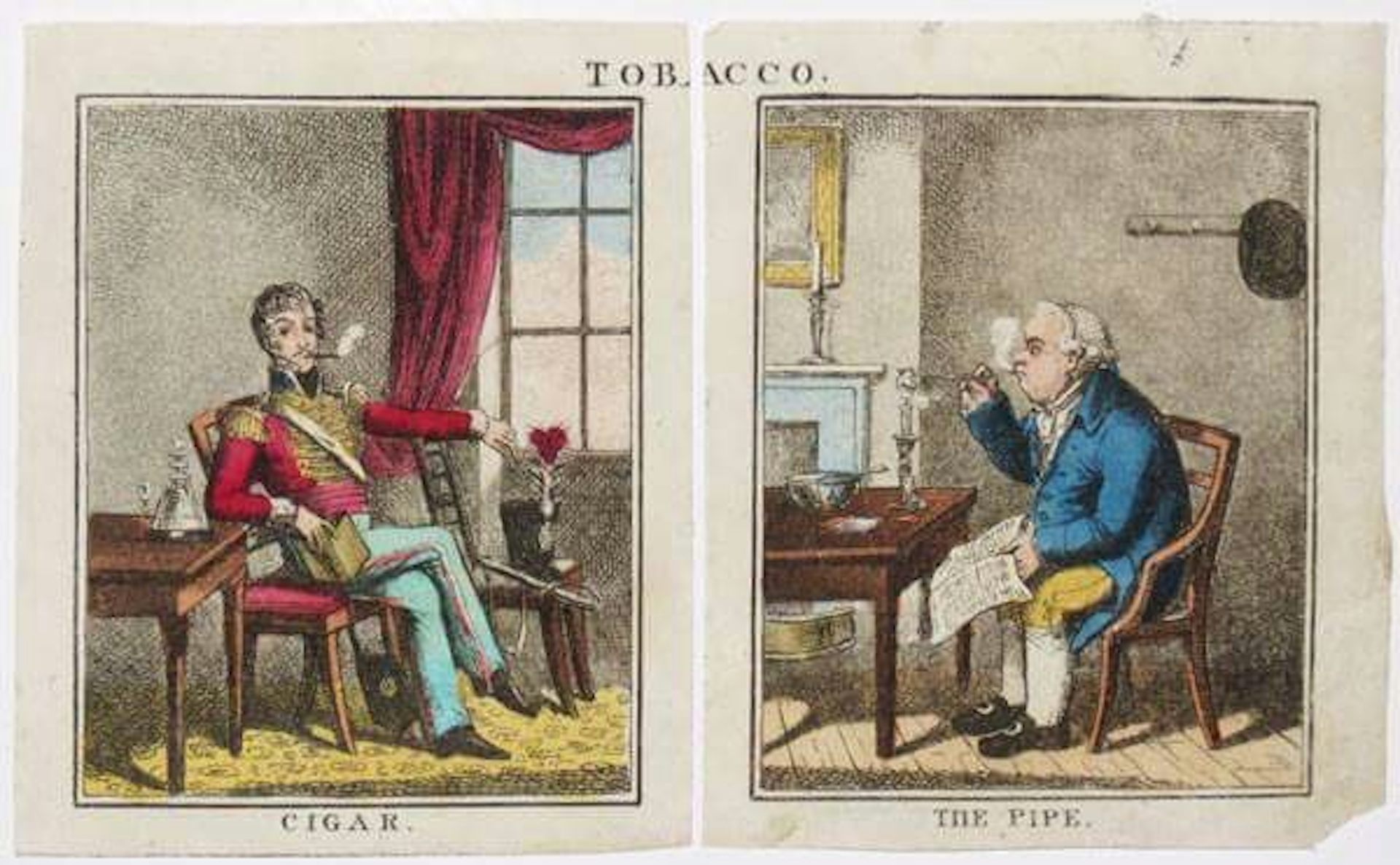 On the left a fashionable cigar smoker and on the right a rather less fashionable pipe-smoker, c.1805. Own collection