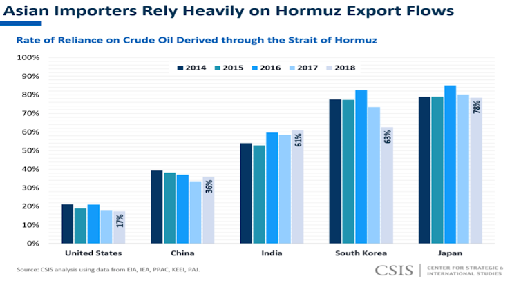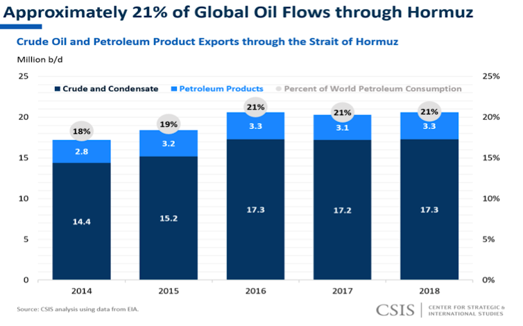 Up to 21% of the world’s oil flows through the Strait of Hormuz, making it a strategic chokepoint – over the course of 2018, an average of 20.7 million barrels of oil passed through it per day. The strait is also crucial for liquefied natural gas (LNG) exports, as more than 25% of the world’s supply, mostly from Qatar, passes through it annually.