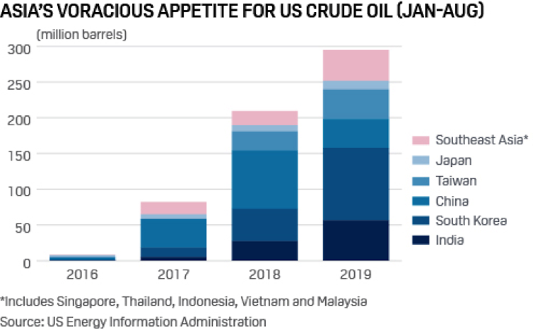 However, since the United States re-imposed sanctions on Iran, and the waivers the US administration provided to certain countries to continue importing Iranian oil ended in May 2019, Asian nations have been pivoting to US imports. The graph below shows a spectacular increase.