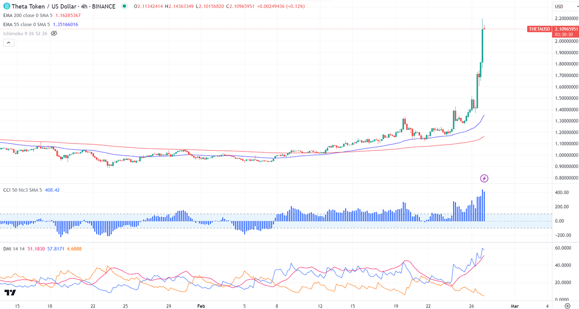 THETAUSD surged more than 95% in the past five days. The pair holds above the short-term (21 and 55 EMA) and above the long-term moving average. It hit a high of $2.200 and is currently trading around $2.132.