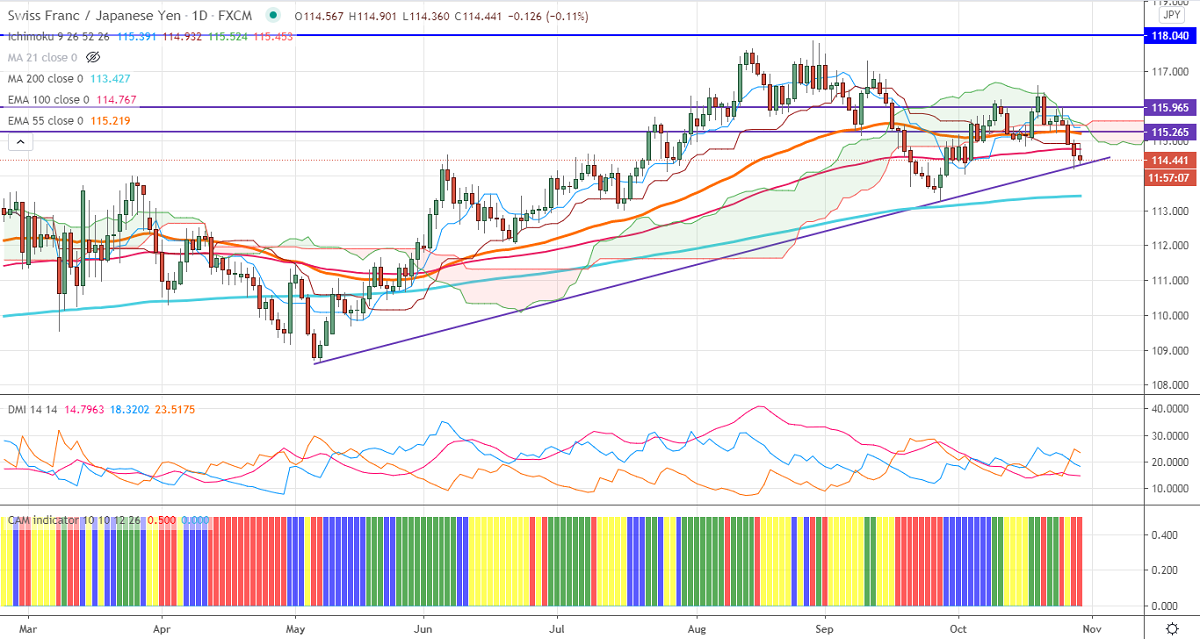 CHFJPY has taken support near the trend line and shown a minor jump. The broad-based US dollar buying on the rise in coronavirus and election uncertainty is supporting the US dollar index at lower levels. USDCHF is holding above 0.91000 levels and any break above 0.9165 confirms bullish continuation. Market eyes US advanced GDP, initial jobless claims for further direction. The intraday trend of CHFJPY remains bearish as long as resistance 115 holds.