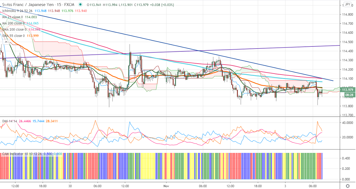 In the 15 min chart, CHFJPY is facing strong resistance at 114.10 (200 EMA). Any break above will take the pair till 114.35/115. On the higher side, near term intraday support is around 113.75, and any indicative break of that level target 113/112 likely.