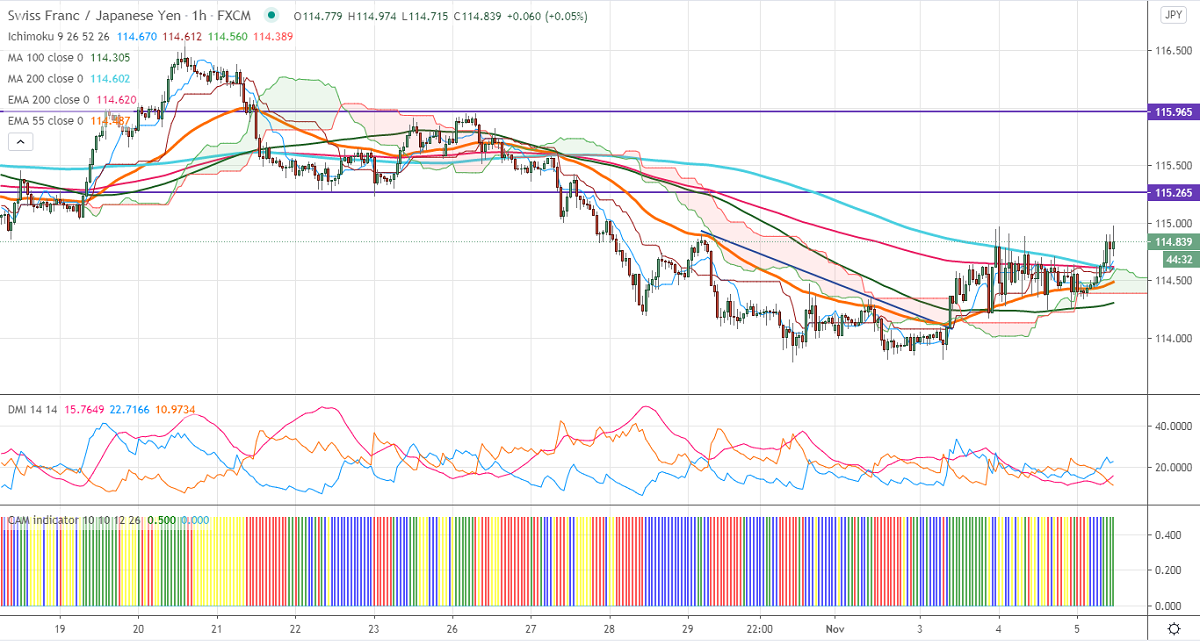 CHFJPY is consolidating in a narrow range between 113.81 and 114.96 for the past three days. The Swiss franc is trading against the US dollar on hopes of Biden to win the Presidential elections. But strength in Yen is putting on this pair at higher levels. USDJPY is trading weak, any violation below 104 confirms bearish continuation. The intraday trend is neutral as long as resistance 115 holds.