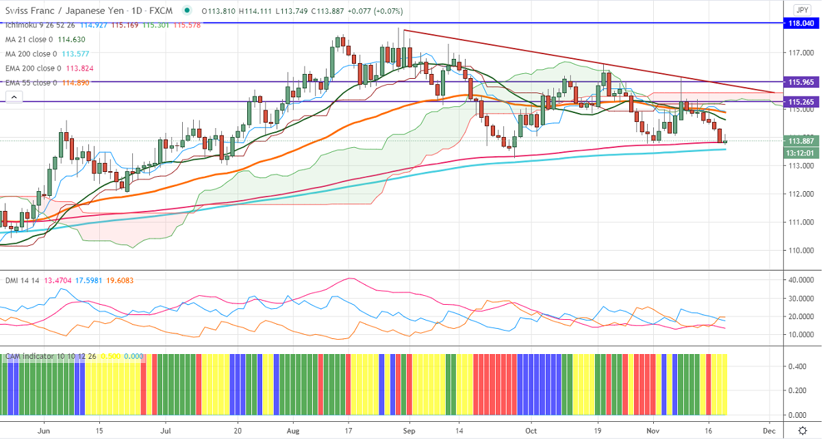 In the daily chart, CHFJPY is facing strong support at 113.55 (200- MA). Any violation below that level targets 113/112. On the higher side, near term intraday resistance is around 114.20, and any indicative break of that level will take the pair to 114.75/115.