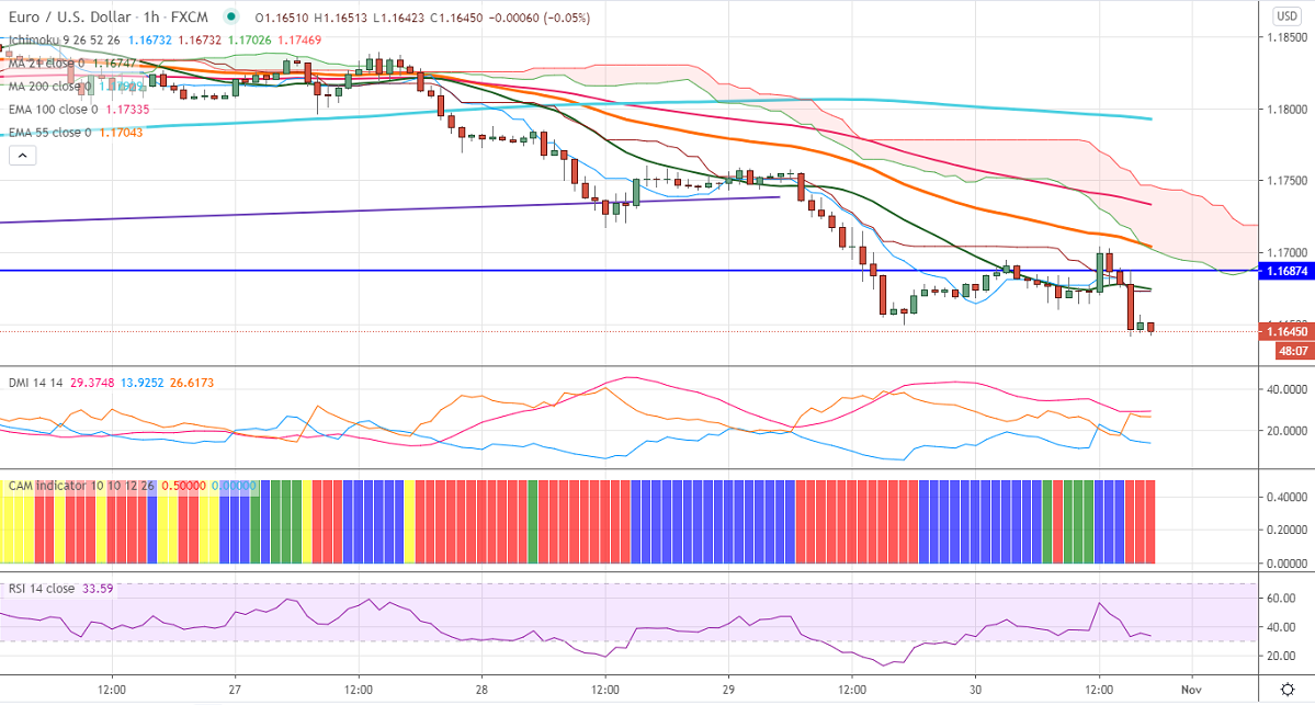 EURUSD has lost more than 50 pips after a minor jump above 1.1700. The demand for Safe-haven assets increased sharply on lockdown due to rising coronavirus cases and US election uncertainty. US personal income came at 0.9% vs forecast of 0.3%, while personal spending rose to 1.4% compared to an estimate of 1.0%. U.S Chicago PMI declined slightly to 61.1 vs 62.4 the previous month. The rise in the number of cases globally has crossed 45m and the death toll crossed 1.15 m. The overall trend of the pair is bearish as long as resistance 1.1720 holds.