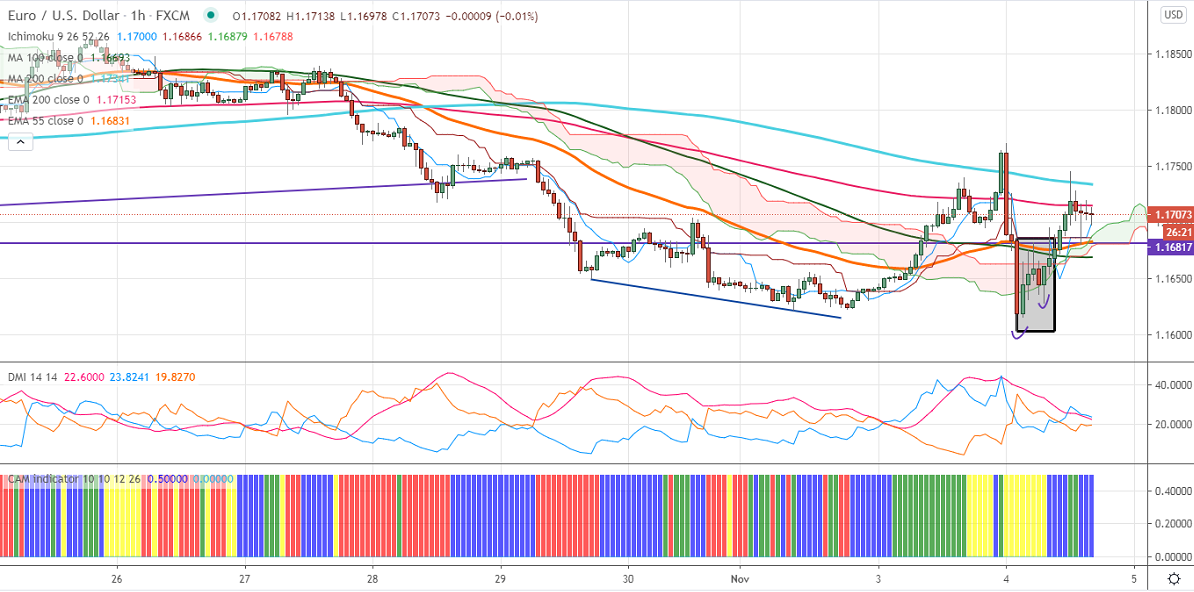 EURUSD trading higher as chances of Biden winning elections increased. The Democratic Presidential candidate Joe Biden leads in Michigan, Wisconsin. The number of private jobs added in Oct increased by 365K compared to the forecast of 650k. The rise in the number of cases globally has crossed 48m and the death toll crossed 1.22 m. The overall trend of the pair is bearish as long as resistance 1.1780 holds.