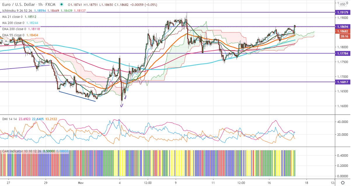 EURUSD jumped sharply above 1.18500 on upbeat market sentiment. The COVID -19 vaccine optimism by Moderna Inc is putting pressure on safe-haven assets like the dollar. The company has said that early data shows its vaccine nearly 95% effective in preventing COVID-19. Markets eye US retail sales and Fed Chairman speech for further direction. The upside in this pair is to be limited as a rise in the number of coronavirus in the U.S. Short term trend of the pair is bullish as long as support 1.1800 holds.