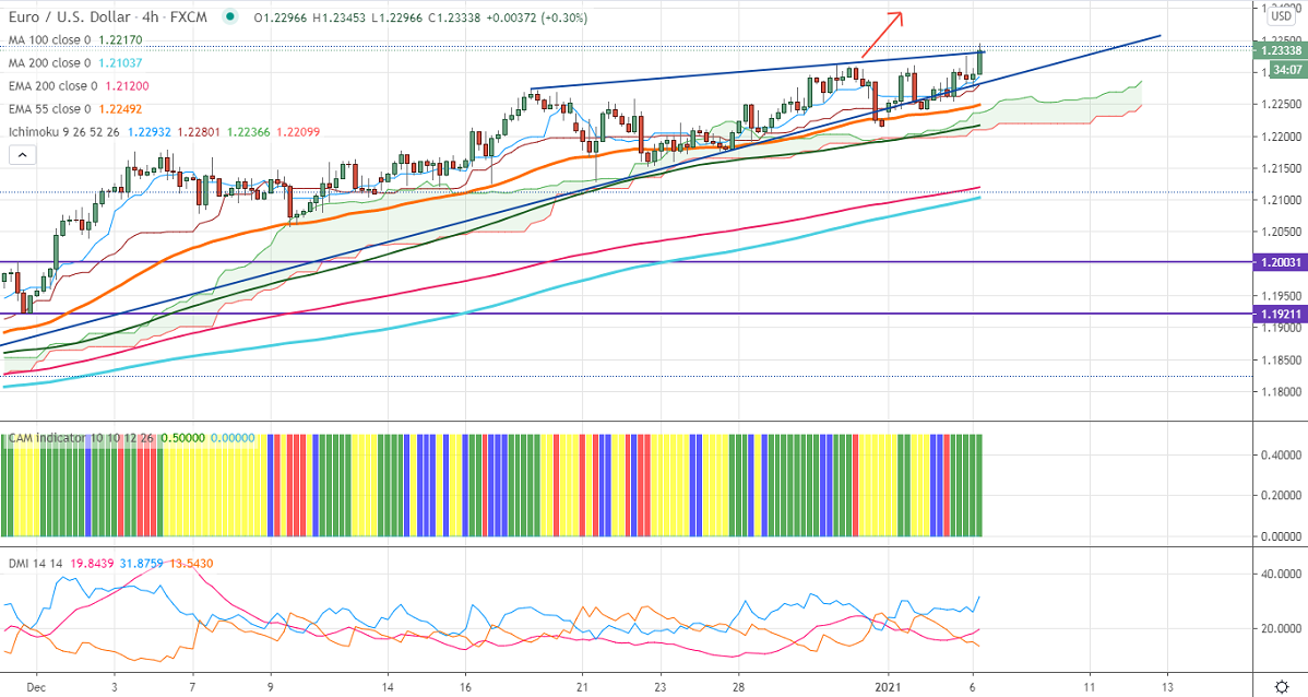 EURUSD continues to trade higher and holding above 1.2300 after Democrats won senate after Georgia run-off. The Democrat's win has increased the chance of more stimuli in the coming months. DXY hits fresh year low on upbeat market sentiment. The intraday trend of EURUSD is bullish as long as support 1.2270 holds.