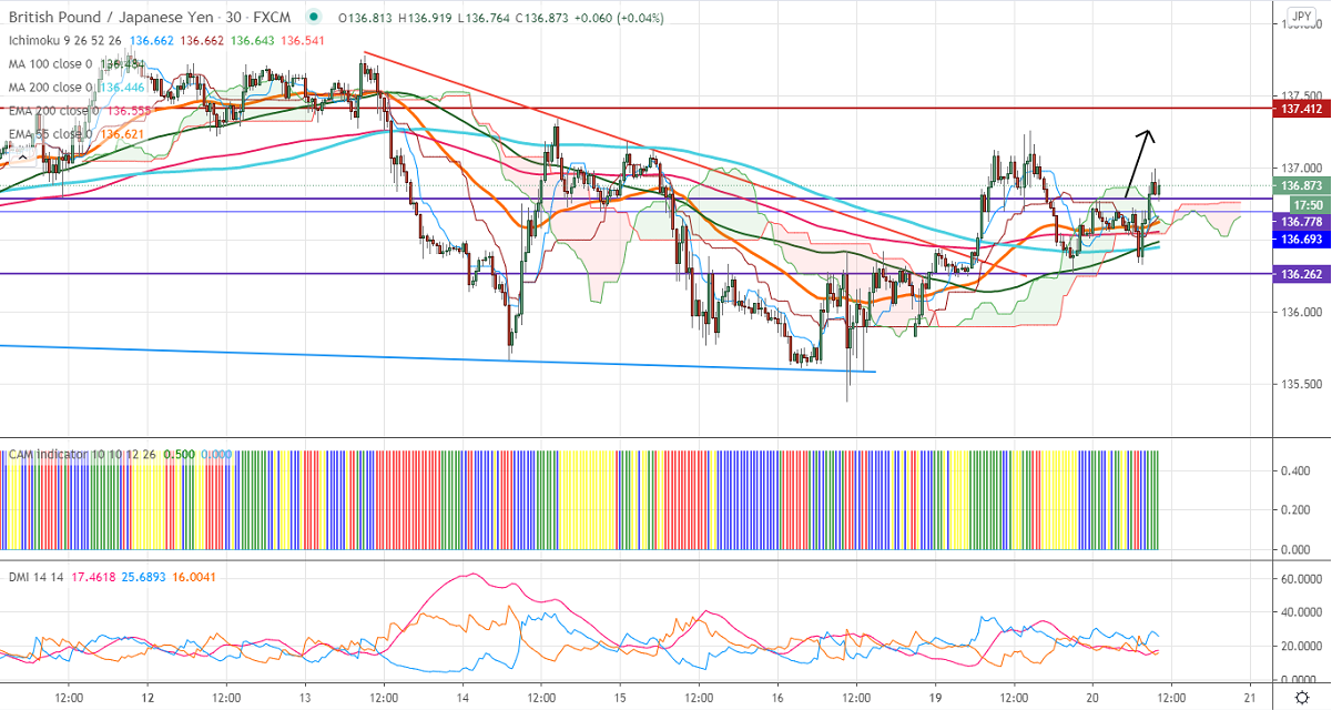 In the Hourly chart, GBPJPY is struggling to close above 200- MA. Any convincing break above 136.82 will take the pair till 137.33/138. On the flip side, near term intraday support is around 136.40 and any indicative break below that level will take the pair till 136.20/136/135.66.