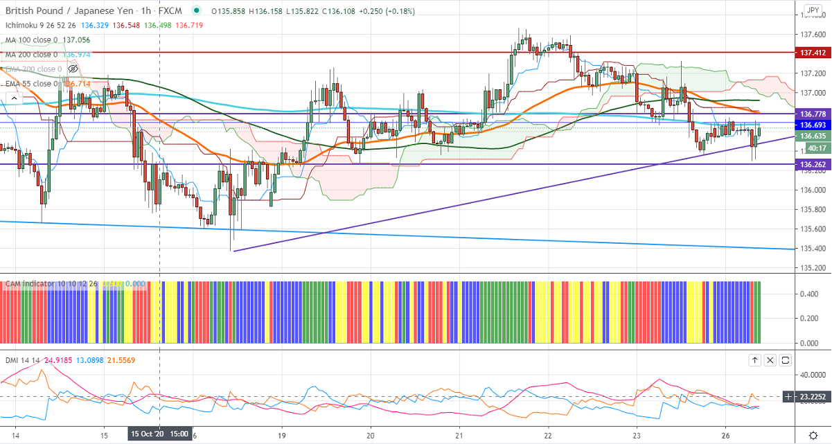 GBPJPY continues to trade weak after forming a top around 137.60. It hits a low of 136.30 and shown a minor recovery. GBPUSD has taken support near 200-H MA and surged past 1.3000 level. The Brexit pessimism and number of new COVID-19 cases in the UK are putting pressure on the Pound sterling at higher levels. The intraday trend of GBPJPY is slightly bullish as long as support 136.20 holds.