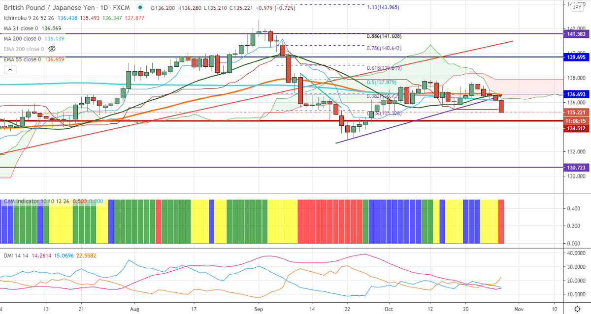 GBPJPY is one of the worst performers for the day and lost more than 100 pips from an intraday high of 136.28. The decline was mainly due to weakness in pound sterling against all majors. GBPUSD has broken significant support 1.3000 on fear of lockdown in London due to a rise in coronavirus cases. GBPUSD is facing strong support at 21-day MA at 1.29688 and any close below that level targets 1.2900. The short term trend of GBPJPY is bearish as long as resistance 136 holds.