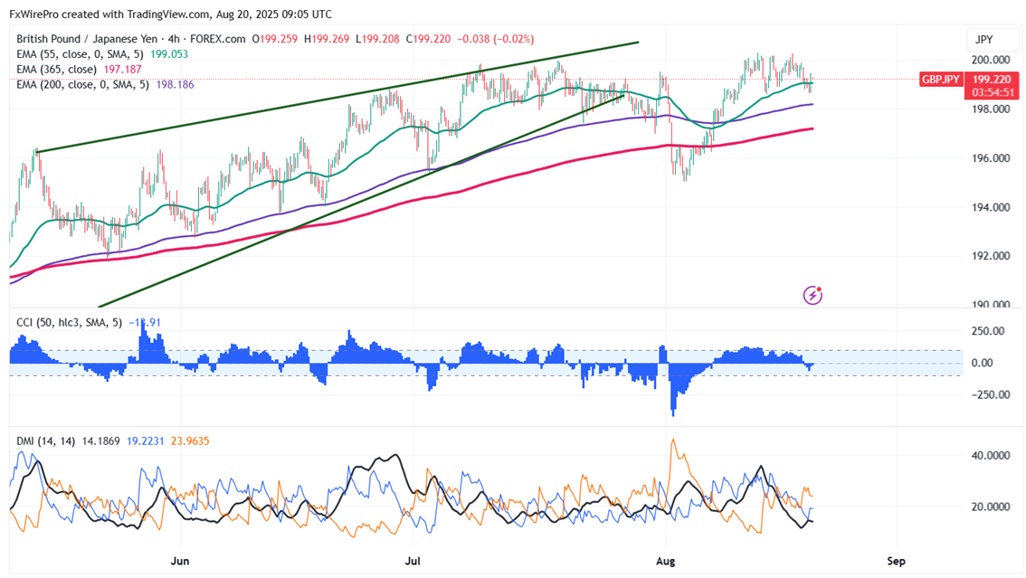 The pair is trading above 55 and 200 EMA and 365 EMA (long-term) on the 4-hour chart, confirming a bearish trend. Any violation below 198.60 indicates the intraday trend is weak. A dip to 197.75/196.70/196.20/195.is possible. Immediate resistance is at 200.30 a breach above this level targets of 202/202.98.