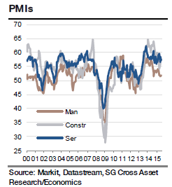 The services PMI is volatile on a month to month basis dipping from 58.5 in June to 57.4 in July. A bounce is expected to 58.3 in August and the overall composite PMI is likely to rise slightly from the July reading of 56.6, adds SocGen.