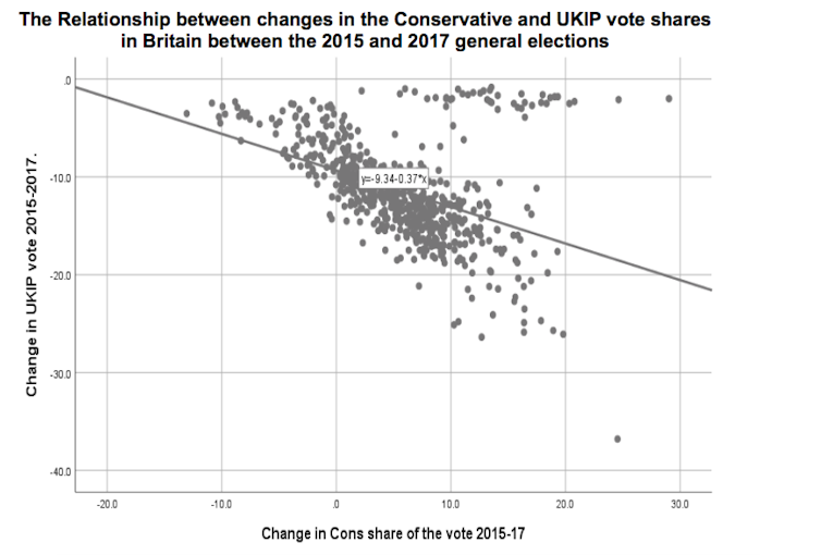 May’s remarkable achievement saved her government from losing the election. Each of the dots in the chart below is a constituency in Britain and the summary line shows that the change in the Conservative and UKIP vote shares were strongly (and negatively) related between the two elections. As the Conservative vote share rose the UKIP vote share fell. This negative correlation was actually stronger (-0.44) than the relationship between changes in the Conservative and Labour vote shares (-0.39), the traditional rivals in British party politics.