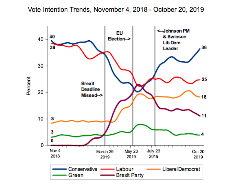 The Conservatives received a poll bounce after Johnson struck a Brexit deal and won his first parliamentary vote on the legislation underpinning it on October 19. Clearly they are anxious to profit from this by calling an early election before the bounce disappears. When Johnson became prime minister in July the party also received a boost, but this petered out by early September, suggesting that the life of the present bounce may be time limited as well.