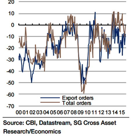 "Moreover, the latest quarterly outlook of the Engineering Employers' Federation reported export orders at a six-year low. The CBI survey is likely to reflect that trend with a decline in export orders leading to weaker total orders and output as well", says Societe Generale.