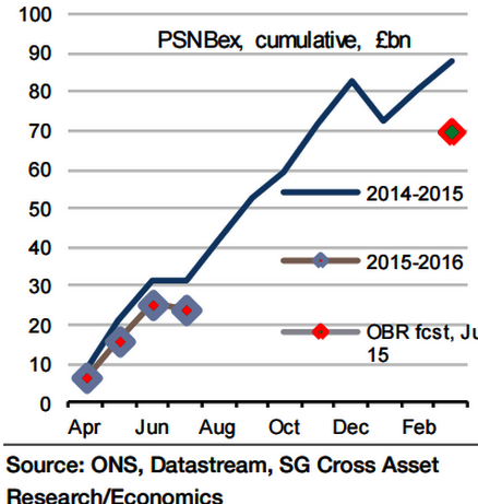 "The improvement will have continued in August, albeit at a slightly slower pace. The PSNBex should move from £-1.3bn in July (always a surplus month because it is a key tax-paying period) to £9.2bn in August, a £1.2bn reduction on the deficit a year earlier", says Societe Generale.