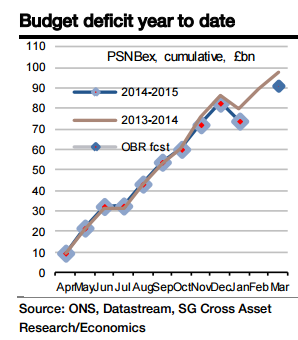 The OBR's updated forecasts for the 2014-15 fiscal year will include implied figures for February and March combined so the February data released here will not alter the market's view of the full-year out-turn.