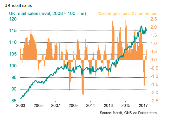 UK consumer prices are rising at an annual pace of 2.9 percent and regular pay is growing at a rate of just 1.7 percent. Real (inflation adjusted) pay is now falling at an annual rate of 0.6 percent, which is the steepest decline seen since 2014. The hurdle to consumer-led growth keeps rising as increasing inflationary pressures cap household purchasing power. Looking ahead, further increase in costs likely from sterling’s substantial post-referendum depreciation.